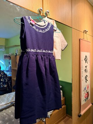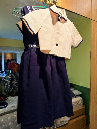 Conjunto de vestido de verano con chaqueta a juego. - Diseño elegante en tonos azul y blanco. - Chaqueta corta con cuello y botones. - Vestido con detalle floral en la cintura.
