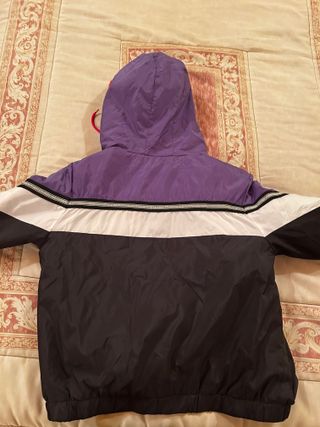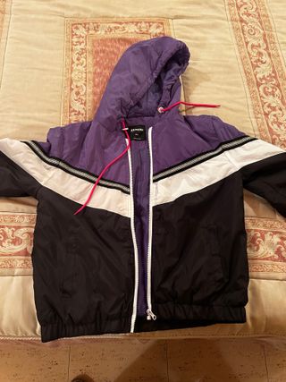 Chaqueta con capucha y cordones de ajuste. - Diseño de bloques de color en morado, blanco y negro. - Cremallera frontal. - Puños y cintura elásticos.
