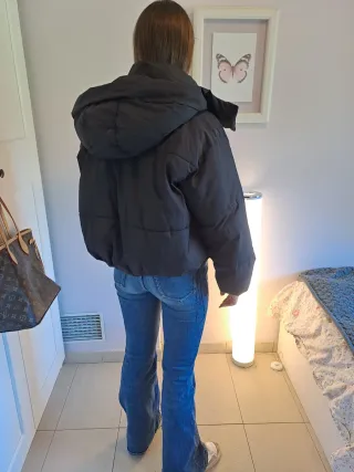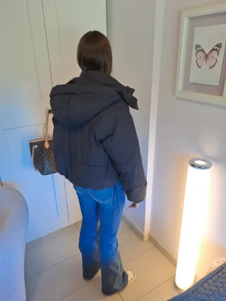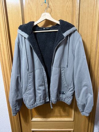 Chaqueta de Zara con un diseño moderno y cálido. - Exterior de color gris. - Interior con forro sherpa negro. - Capucha integrada. - Cierre de cremallera. - Bolsillos frontales.