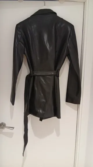 Chaqueta estilo tres cuartos de polipiel. - Diseño de doble botonadura. - Cinturón a juego para anudar. - Cuello solapa clásico.