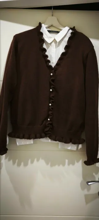 Chaqueta de punto con un diseño encantador y detalles especiales. - Adornos de volantes en el escote y puños. - Cierre de botones con perlas. - Bajo y puños con acabado volante.