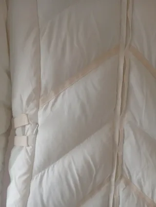 Cazadora acolchada de color blanco, con un diseño moderno y elegante. - Cuello alto con textura. - Cierre de cremallera. - Detalle de cintas en los laterales. - Acolchado en forma de espiga.