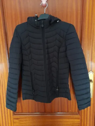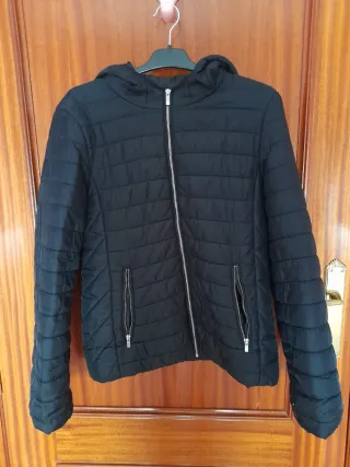Chaqueta acolchada de color negro simple, con capucha ajustable integrada , cierre de cremallera frontal, bolsillos laterales con cremallera y bolsillos interiores. Es una talla S y está nueva.