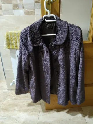 Chaqueta de la marca Punto ROMA en color morado. Diseño con textura y cuello redondo. Es morado/marron oscuro - Cierre de botones. - Bolsillos frontales.