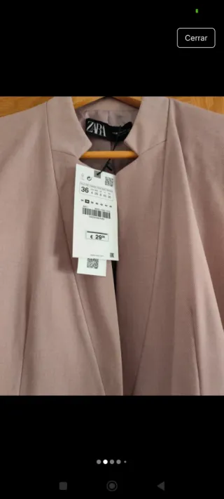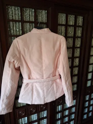 Chaqueta de entretiempo con bolsillos delanteros en vivo. Botones en dorado. CREO que es antelina, pero no lo sé. Color: rosa empolvado. Marca: Sfera Talla: L. Medidas en las fotos. Composición: 96% poliéster, 4% elastano. Estado: Nuevo sin etiqueta. Precio: 35€