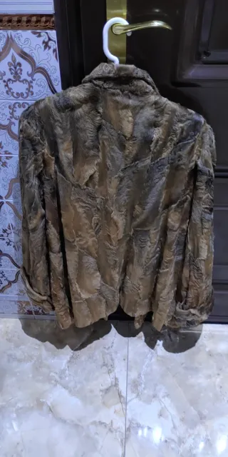 Chaqueta de piel de cordero muy suave. La piel es súper suave y está como nueva. Los elásticos del cuello y cintura están algo decolorados con zonas más pardas. - Cierre de cremallera. - Cuello estilo bomber. - Dos bolsillos frontales con botón.