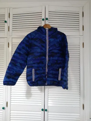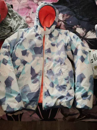 Cazadora reversible con un diseño moderno y llamativo. - Estampado geométrico en tonos azules y blancos. - Interior en color naranja vibrante. En perfecto estado