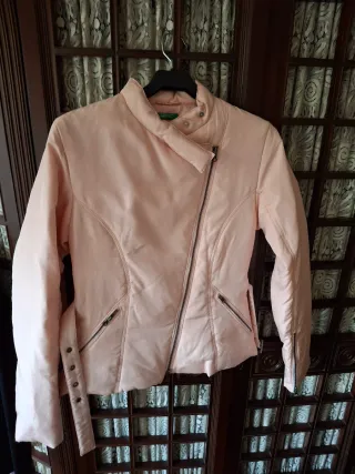 Preciosa chaqueta acolchada con un diseño moderno y favorecedor. No pone talla (He puesto la que creo que le corresponde. Debe estar entre M y S). Ver medidas .Puesta poquísimo. Impecable. Aunque pone 'no lavar', se ha lavado en lavadora y ha salido perfecta; éso sí, en programa delicado. - Cierre asimétrico con cremallera. - Bolsillos con cremallera. - Puños con cremallera.