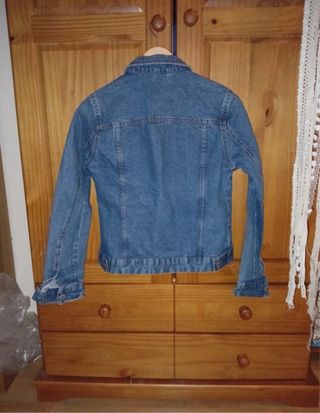 Chaqueta vaquera clásica de Levis para mujer. Es corta, con dos bolsillos laterales y dos con botón en el pecho. Talla M para adolescentes, talla S para adultas. Es algo más oscura de lo que se ve en las fotos. Muy bien cuidada, en perfecto estado.
