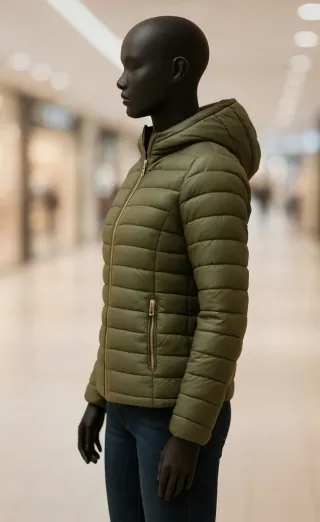 Chaqueta acolchada de color verde con un diseño moderno y práctico. Cuenta con capucha para mayor protección. - Cierre de cremallera frontal. - Bolsillos laterales. - Tejido ligero y cálido.