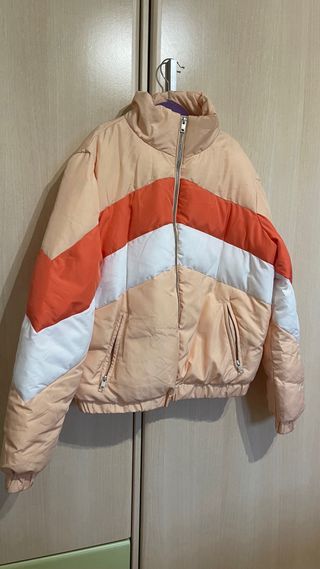 Chaqueta acolchada con diseño de bloques de color. - Diseño chevron en naranja, blanco y coral. - Cuello alto. - Cremallera frontal. - Bolsillos laterales con cremallera. - Sirve para talla M