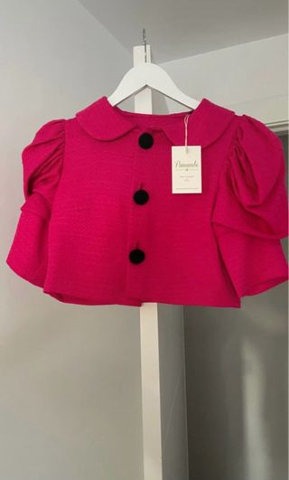 Conjunto de chaqueta corta y pantalón de vestir. - Chaqueta con cuello redondo y botones negros. - Mangas abullonadas. - Pantalón de talle alto con pinzas.
