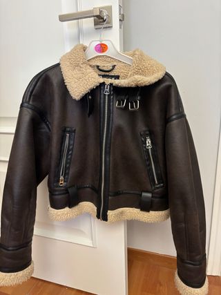 Chaqueta estilo aviador de Zara. - Diseño corto. - Cuello y forro de borreguito. - Cierre de cremallera. - Bolsillos con cremallera.