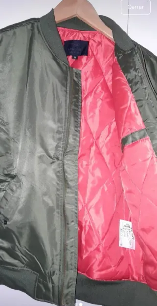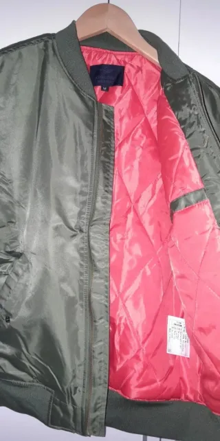 Chaqueta estilo bomber con forro interior llamativo. - Cierre de cremallera frontal. - Puños y cintura elásticos. - Bolsillos laterales.
