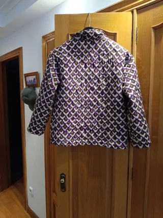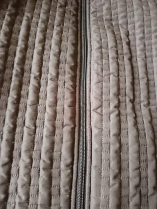 Chaqueta acolchada de mujer, ligeramente entallada, con cuello alto y cierre de cremallera, hecha en España. Pone talla 44 pero yo diría que corresponde a una L. Mide 44cm de hombros, 51cm entre sisas, 54 en la cadera y 65 de largo. Sienta muy bien y se encuentra en muy buen estado. - Diseño acolchado con costuras verticales. - Bolsillos laterales con cremalleras. - Cuello alto.