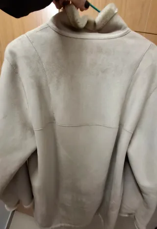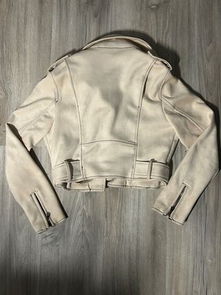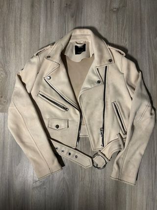 Chaqueta estilo biker en color beige, efecto ante. En muy buen estado, sin manchas ni desgaste. Cremalleras metálicas, cinturón ajustable y corte corto muy favorecedor. Perfecta para entretiempo y looks casuales.