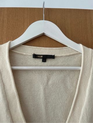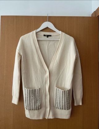Chaqueta de lana beige de la marca Maje. - Bolsillos delanteros adornados con tachuelas plateadas. - Cierre de botones. - Cuello en V.