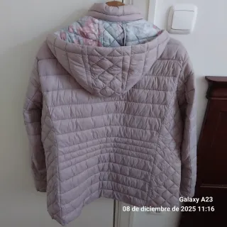 Chaqueta acolchada con diseño de rombos. Es talla de ñiña pero se puede usar para adulto. Equivale a una talla S 164 cms. El color es un tostado claro - Cierre de cremallera. - Capucha integrada.