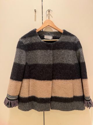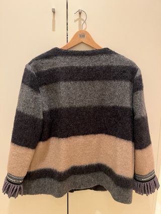 Chaqueta de la marca Hongo con un diseño de rayas horizontales. - Diseño a rayas en tonos beige y gris. - Puños con detalle de flecos y adornos. - Cierre frontal.
