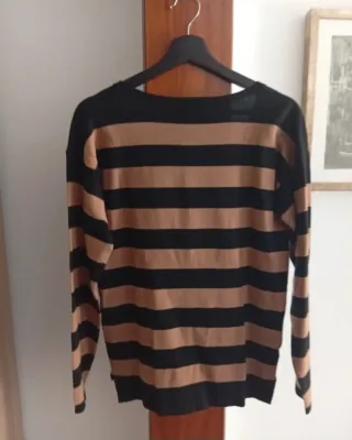Chaqueta de punto con capucha. Diseño de rayas clásico y moderno. Perfecta para añadir una capa extra a tu atuendo. Tejido elástico. Cremallera. Se ha estrenado, 2 lavados. Talla 40-42 mujer. Es ancha. Puede servir para una talla 44. - Diseño de rayas horizontales. - Cremallera frontal. - Capucha integrada.