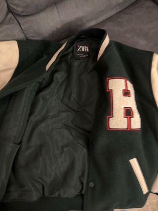 Chaqueta estilo bomber de Zara con un diseño llamativo. - Cuerpo principal en color verde oscuro. - Mangas en color blanco roto. - Detalle de parche con la letra H en grande. - Insignia lateral Hudson Pier League Team. - Puños y bajo con rayas. - Cierre de botones a presión.