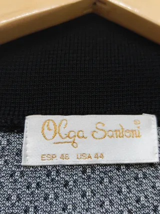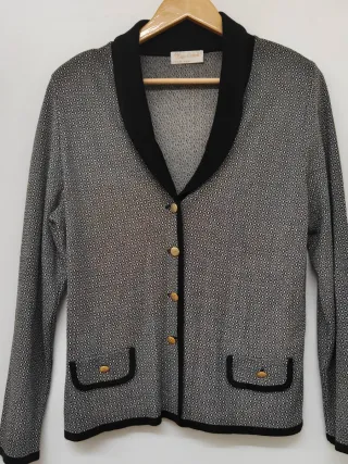 Como nueva, marca Olga Santoni, talla 46, chaqueta de punto con un diseño jacquard en tonos grises y negros. Presenta un cuello solapa y detalles en contraste.Medida de sisa a sisa 52 cm, medida de largo 60 cm. - Cierre de botones dorados. - No tiene bolsillos. - Ribete negro en cuello, puños y bajo.