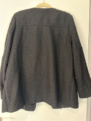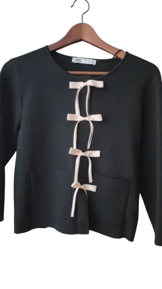 Chaqueta de la colección de Zara en color negro. Presenta un diseño frontal con varios lazos decorativos. - Cuello redondo. - Cierre de lazos. - Bolsillos laterales. - Escote caja. - Tejido fuerte y consistente. Composición en foto. - IMPECABLE!! Una puesta durante unas horas. - Temporada invierno 2025