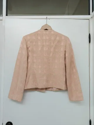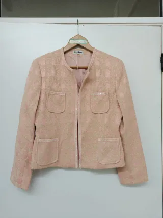 Elegante chaqueta de tweed con un diseño texturizado en tonos rosa y beige. Ideal para añadir un toque sofisticado a tu vestuario. - Cuello redondo. - Cierre frontal. - Bolsillos de solapa. - Acabado con detalles brillantes en los bordes.