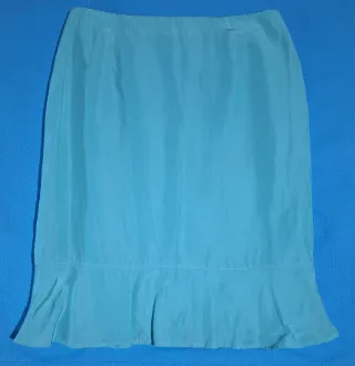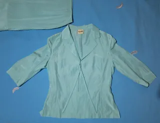 Elegante conjunto de chaqueta y falda, tela con brillo color verde agua. - Chaqueta con manga 3/4, cierre en parte delantera con tiras para hacer lazada - Falda a juego, con volante inferior. - Talla 42 que equivalente mas bien a mediana.
