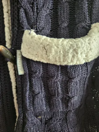 Chaqueta de punto azul con detalles en blanco y forro interior de borreguito. Colección School days. - Diseño de trenzas en el tejido. - Cierre con botones de madera. - Capucha forrada. - Bolsillos delanteros con borde de borreguito. - Puños y bajo con detalle de borreguito.