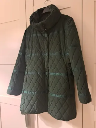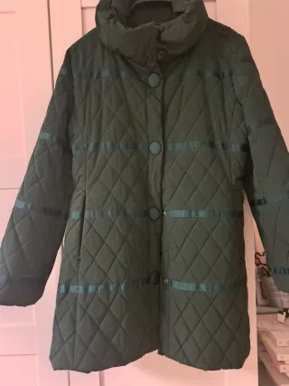 Chaqueta acolchada de color verde oscuro, con un diseño elegante y detalles de cintas. - Cierre de botones. - Cuello alto. - Bolsillos laterales.