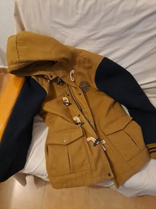 Chaqueta larga acolchada con un diseño moderno y cálido. - Capucha con pelo sintético. - Estampado de camuflaje sutil. - Cierre de cremallera frontal. - Cintura ajustable con cordones. Es preciosa lo único que en la parte de delante como se puede ver en las imágenes, está un desgastado en la zona de la cremallera. De resto está muy bien, es muy abrigada y gordita.