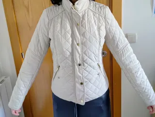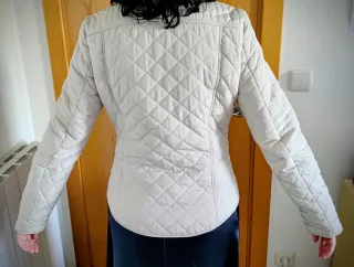 Pone talla M pero es un tallaje pequeño Marca Full Fashion Color marrón Composición: 65% viscosa 35% algodón Chaqueta acolchada Corte entallado Se abrocha con cremallera central (con doble cursor, con dos vías)