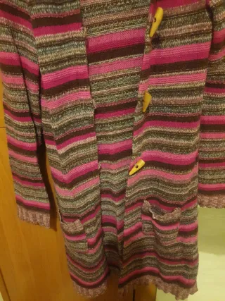 Chaqueta de punto larga con capucha y cierre de botones de madera. Presenta un diseño de rayas multicolor en tonos rosas y marrones. - Diseño de rayas. - Cierre de botones de madera. - Con capucha. - Bolsillos delanteros.