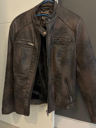 Chaqueta de polipiel con un diseño moderno y un acabado desgastado que le da un toque único. Perfecta para un estilo casual. - Cierre de cremallera frontal. - Bolsillos con cremallera. - Cuello redondo con broche. - Forro interior suave.