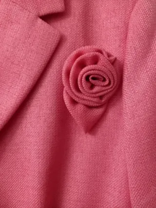 Elegante conjunto de chaqueta y falda en tono rosa. - Chaqueta con solapas clásicas. - Adorno floral en la solapa. - Cierre frontal de la chaqueta. - Forro rosa