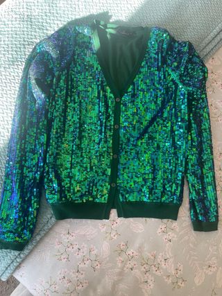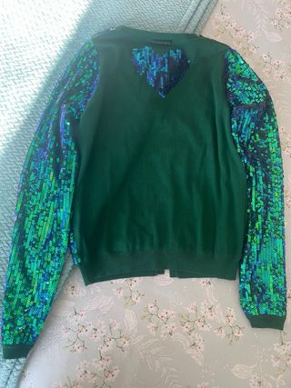 Chaqueta de la marca Twin Set con un diseño llamativo de lentejuelas. - Lentejuelas en tonos azules y verdes. - Cuello en V. - Cierre de botones con la marca grabada. - Puños y bajo de canalé. - Interior forrado totalmente - Únicamente la puse un par de veces por lo que está impecable