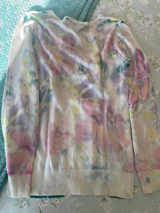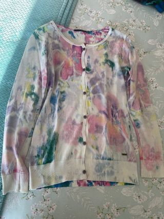 Chaqueta de punto con un vibrante estampado floral. - Diseño de manga larga. - Cuello redondo. - Cierre de botones con logo impreso en ellos. - Puños y bajo de canalé. - Interior de la prenda con colores más llamativos. Cuando compré la prenda me dijeron que quitando la etiqueta y cambiando los botines perfectamente podría ponerla por ese lado. - La he puesto muy poco por lo que está perfecta