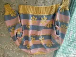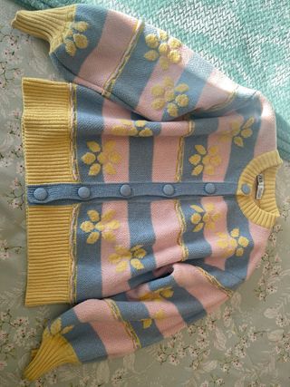 Chaqueta de punto con un diseño alegre y colorido. Presenta un estampado de rayas verticales en tonos pastel y flores bordadas. - Mangas abullonadas. - Cierre de botones. - Puños y bajo de canalé.