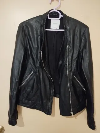Vendo chaqueta corta de efecto piel en color verde claro en talla 36 o S. Está en perfecto estado, sin estrenar y con etiqueta. - Cierre de cremallera. - Bolsillos laterales con cremallera. - Cuello solapa.