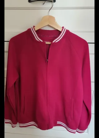 Chaqueta estilo bomber en color fucsia, con detalles de rayas blancas en cuello y puños. - Cierre de cremallera frontal. - Dos bolsillos laterales. - Puños y cuello elásticos.