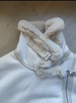 Chaqueta tipo aviador en color blanco roto / crema, con forro interior de borrego suave en cuello, puños y bajo. Diseño cruzado con cremallera plateada y bolsillos laterales con cierre. Muy calentita, cómoda y perfecta para otoño e invierno. ✨ Estilo elegante y moderno ✨ Ideal para looks casuales o más arreglados ✨ Tejido suave y agradable al tacto 📌 Estado: muy bueno 📌 Color: blanco roto / beige 📌 Temporada: otoño – invierno Puesta en muy pocas ocasiones, estado perfecto. Medidas sisa 55 cm Cualquier duda, ¡escríbeme! 😊