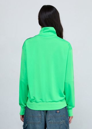 Chaqueta deportiva Adidas en llamativo color verde neón. Perfecta para un estilo urbano y deportivo. - Diseño con cuello alto. - Cierre completo con cremallera. - Tres rayas características en las mangas. - Logo de Adidas en el pecho. Talla XS