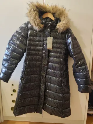 Elegante cazadora larga con acabado brillante. - Diseño acolchado. - Capucha con pelo. - Cremalleras laterales.