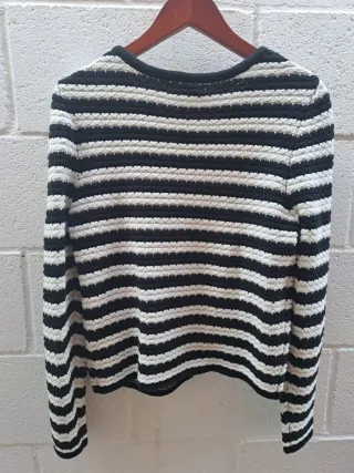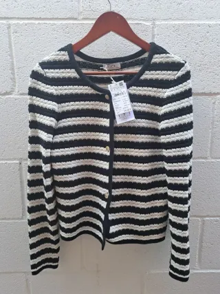 Chaqueta de punto con diseño de rayas. - Cierre de botones dorados. - Cuello redondo.