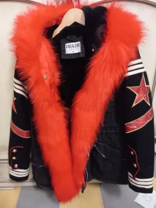 Chaqueta de diseño llamativo con detalles en rojo. - Ribete de pelo sintético en color rojo. - Adornos de estrellas rojas y cintas en las mangas. - Botones dorados decorativos.