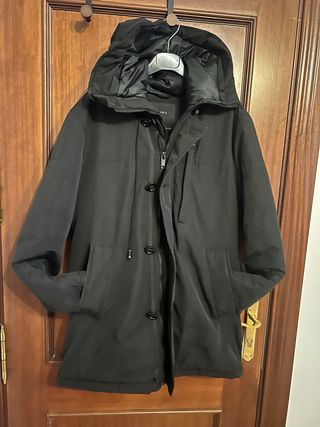 Chaqueta de la marca Zara en color negro, con diseño moderno y capucha. - Cierre frontal con cremallera y botones. - Bolsillos laterales. - Capucha ajustable.