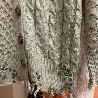 Chaqueta de punto con cuello pico y detalle de tachuelas. Da mas talla - Diseño de punto trenzado. - Cierre de botones. - Bordes deshilachados con tachuelas.