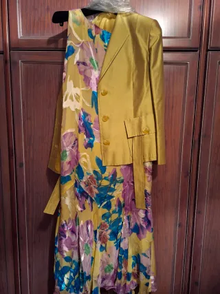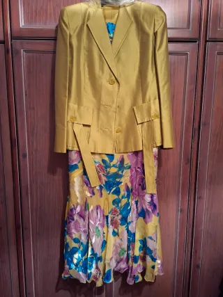 Elegante conjunto de dos piezas para mujer. - Chaqueta de color dorado. - Vestido con estampado floral multicolor.