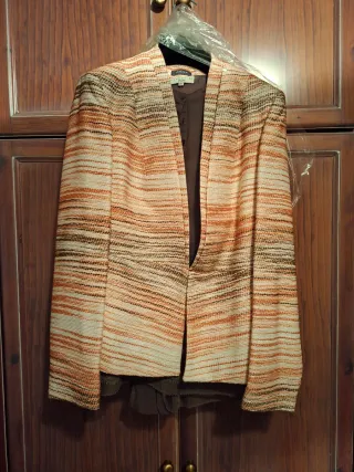 Elegante conjunto de dos piezas para mujer. - Chaqueta de corte clásico. - Falda con estampado vibrante y volantes.